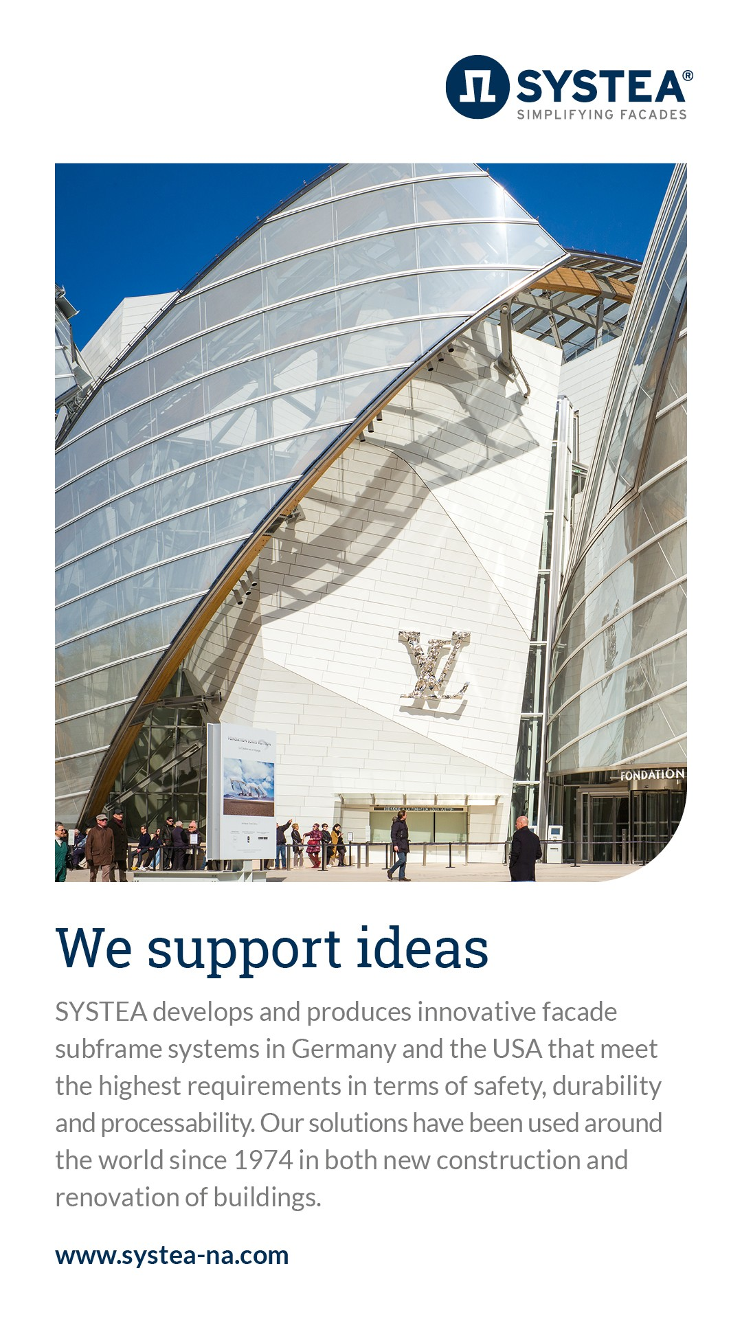 The SYSTEA brand has stood for innovative subframe systems for suspended back-ventilated rainscreen facades since 1974. At our sites in Germany and the USA we develop and produce high-quality solutions in collaboration with leading facades cladding manufacturers with optimum price/performance ratios.